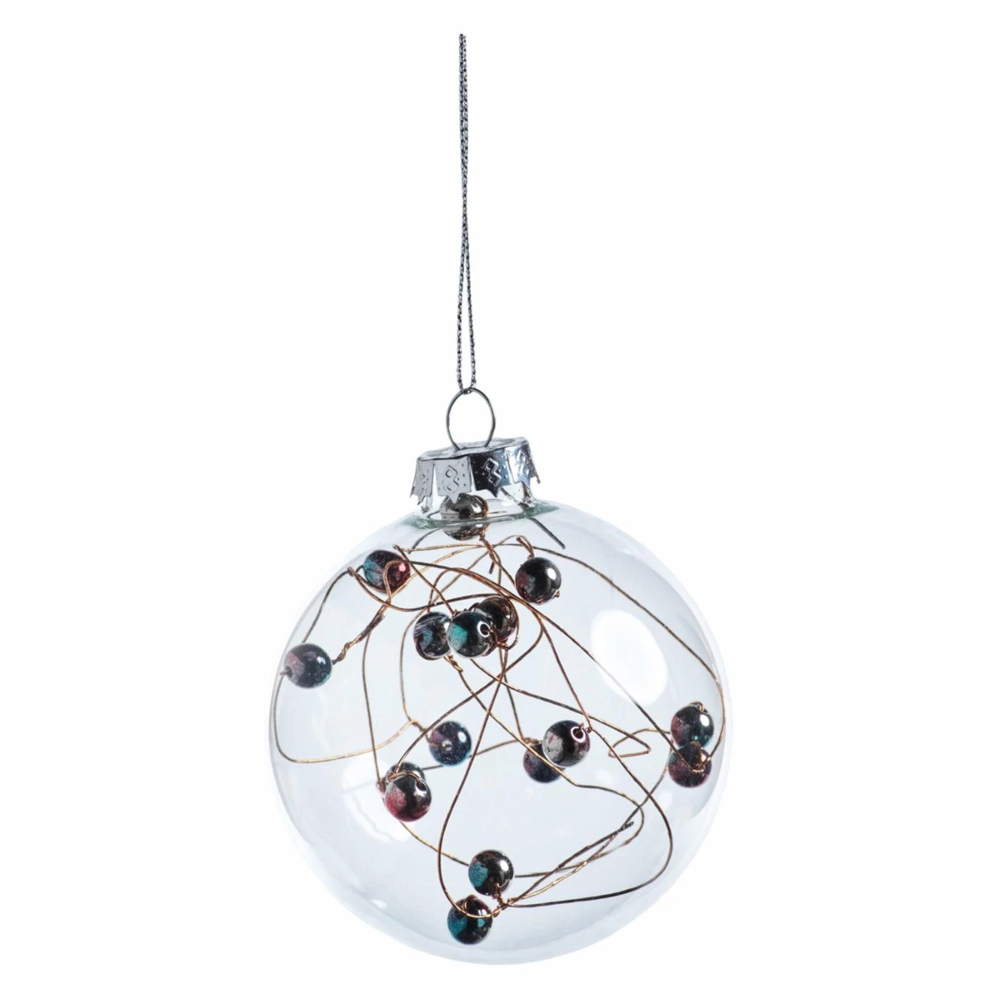 Decorate your Christmas tree with the Multicolor Beaded Ball Ornament Set. These ball ornaments are made of clear glass. On the inside, multi-colored beads connected by shaped wire give the ornaments a contemporary look. Choose from available sizes and amounts.