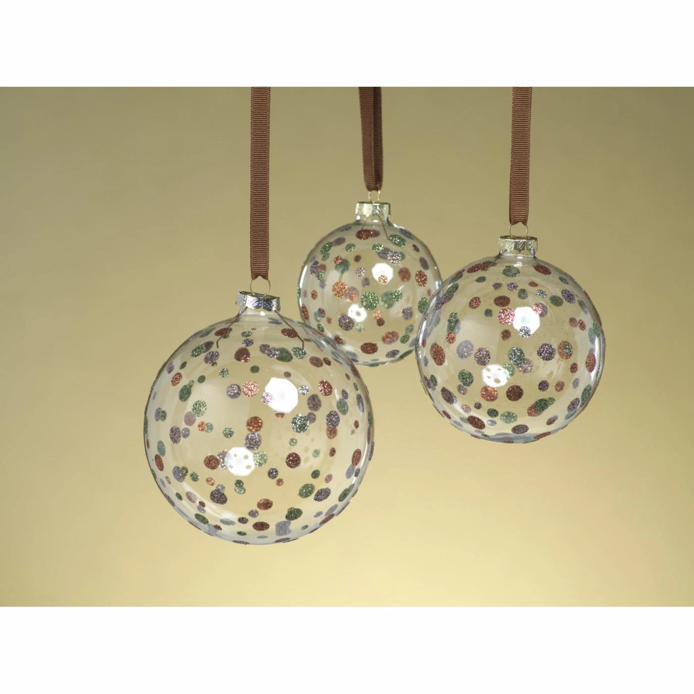 Offer your wreath or tree some gorgeous modern trim with the Glittered Polka Dot Holiday Ball Ornament – Set of 4. This set provides you with four matching ball ornaments. Each ornament is rendered from durable, clear glass with a metal cap Glittered polka dots cover the surface, lending a modern allure. Choose the color option that works best from the available options.