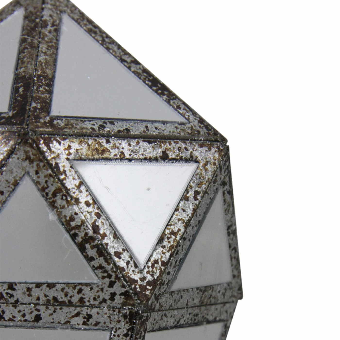 Gleaming mirrored finishing gives the Northlight 10.5 in. Geometric Drop Ornament a sleek look. The geometric shape looks contemporary, while weathered brown detail adds vintage charm. This ornament is crafted from durable plastic and features a hanging loop at the top.