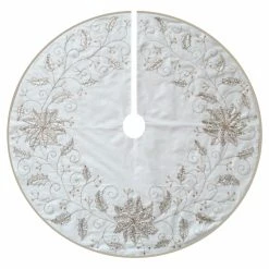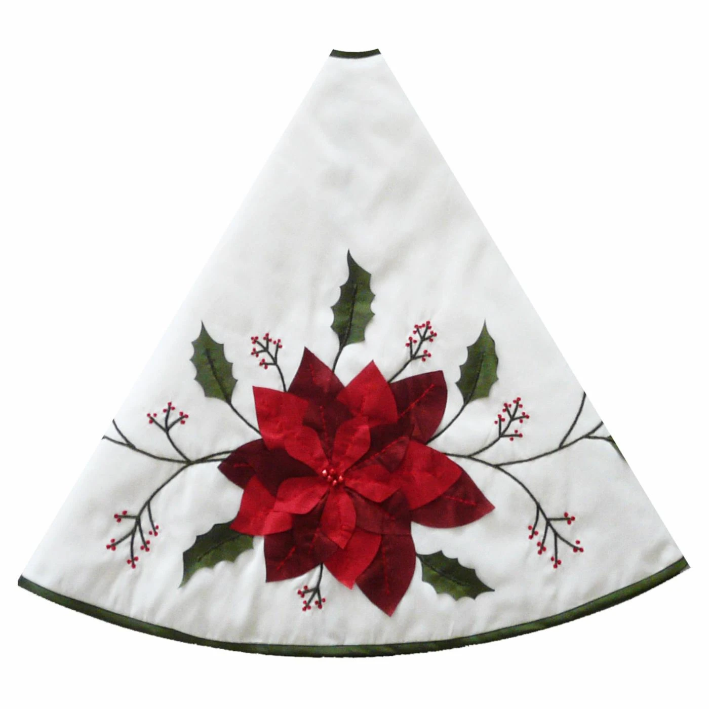 The Kurt Adler 54 in. Ivory with Holly Leaves and Poinsettia Tree Skirt is like a little winter garden beneath your Christmas tree. This round tree skirt is made of a white fabric with bright red poinsettia and dark green holly leaf appliques. A thin green border creates a clean finish.