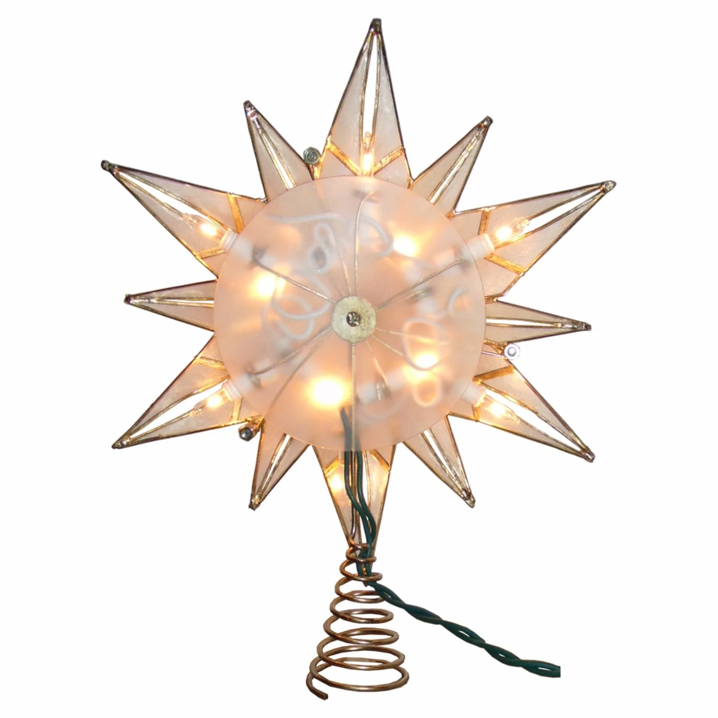 A star tree topper is a classic; add the Kurt Adler 10.24 in. 10 Light 12 Point Capiz Star and Center Gem Tree Topper to your Christmas tree for a shimmering finishing touch with soft, warm light. The 12-point star is made of capiz with gold glitter edging. It’s lit by 10 included white incandescent lights. A gem adds sparkle to the center of the star.