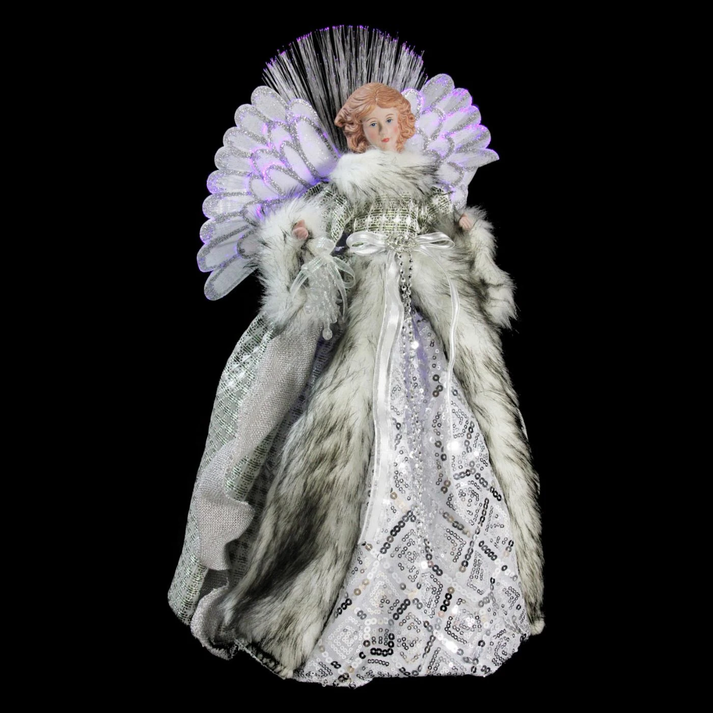 Make your festive home heavenly with the Northlight 16 in. Lighted Fiber Optic Angel Christmas Tree Topper, featuring an angel wearing a silver, shimmering coat, dress, and faux fur accents. This incredible Christmas tree topper is further enhanced with fiber optic wings that change color to bring your home a uniquely vibrant look throughout the season.