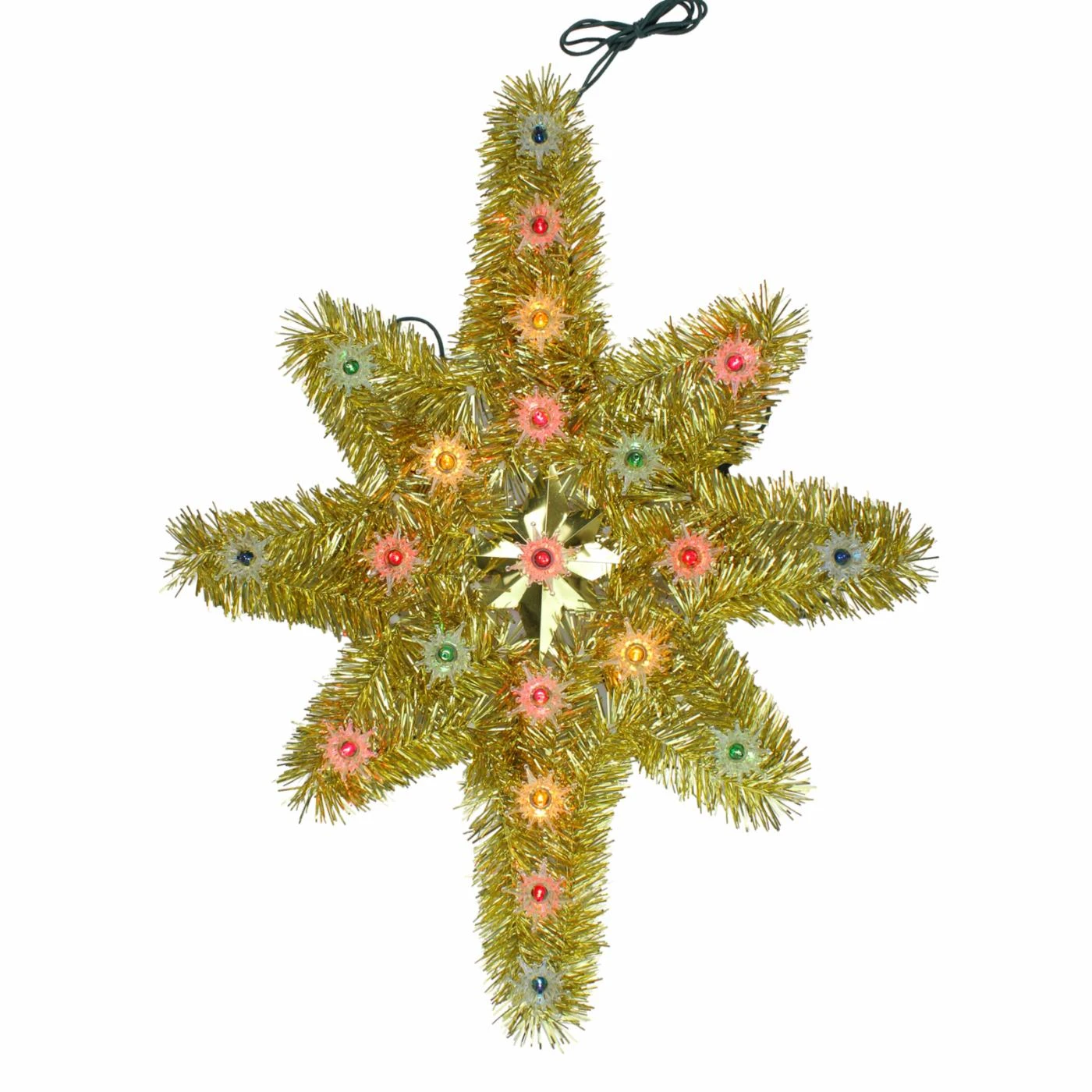 Bring brightness to your seasonal dΓ©cor with the Northlight Oversized Lighted Gold Tinsel Star of Bethlehem Christmas Tree Topper, crafted of shimmering gold tinsel in a classic star design. You’ll love this cheerful tree topper that includes 21 bulbs that light up in a myriad of brilliant colors.