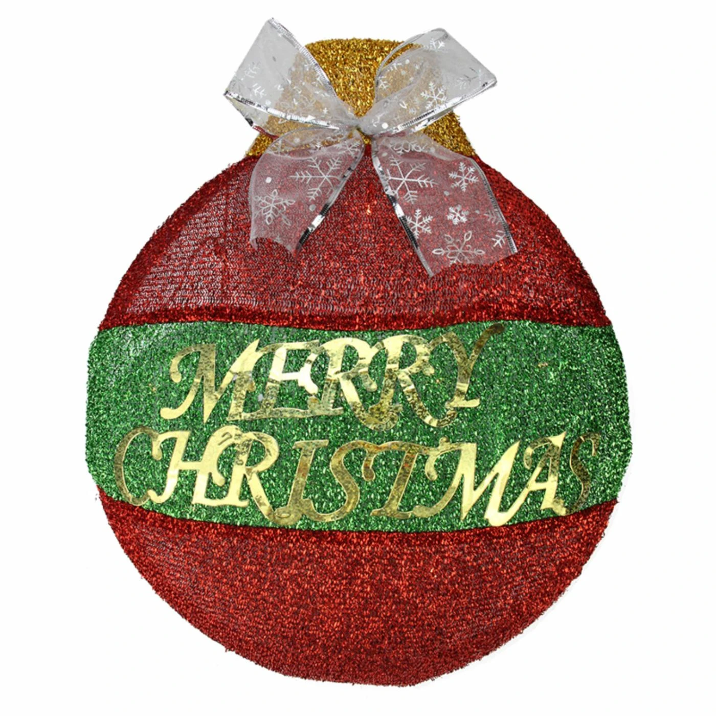 Hang the Northlight LED Lighted Merry Christmas Ornament Hanging Wall Decoration on your walls to give your home a colorful, festive addition. Crafted in an ornament shape, this lighted wall decoration features 15 warm white LED lights and colors of green and red with the words Merry Christmas in gold.