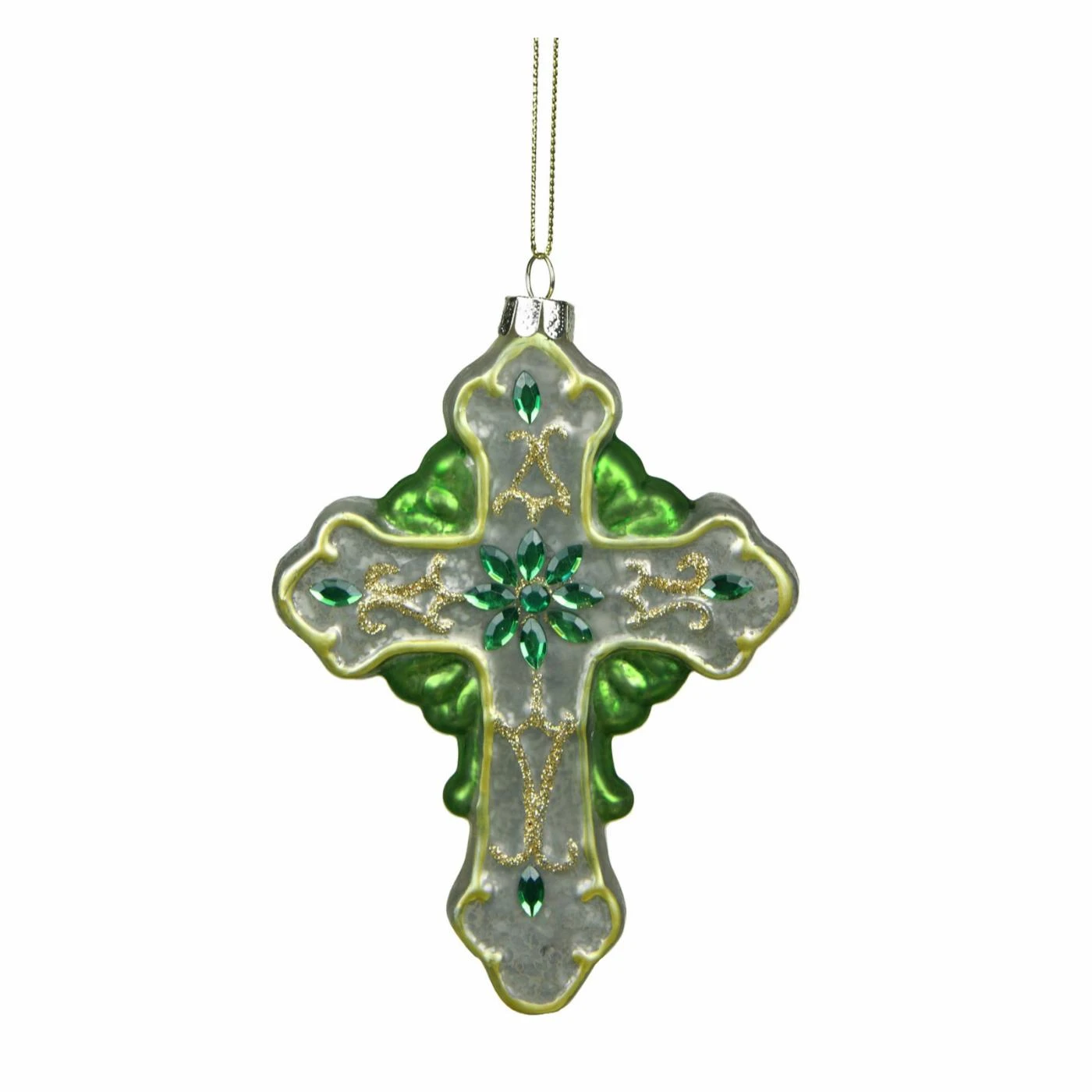 Add color to your holiday decor with the Northlight Luck of the Irish Green and White Mercury Finish Cross Glass Christmas Ornament. This Irish-themed ornament is embellished with rhinestones and glitter for a scintillating effect. Place near holiday lights for reflective brilliance. It comes ready to hang with a gold cord.