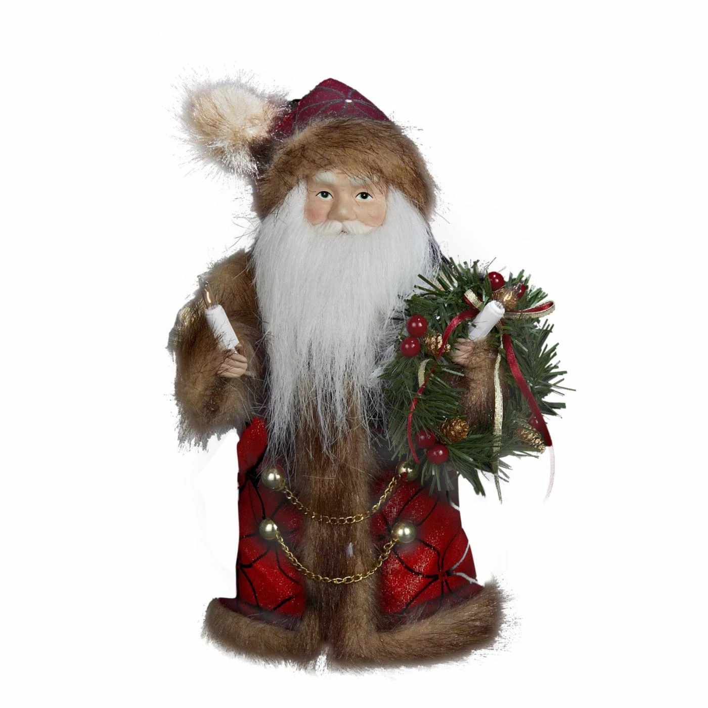 Top off your Christmas tree in luxurious style by showcasing the Kurt Adler 10 in. 10-Light Burgundy and Brown Santa Tree Topper. Santa Claus is beautifully clad in a red and brown ensemble and holds a candle in each hand. Plug in this tree topper to see those candles glow.