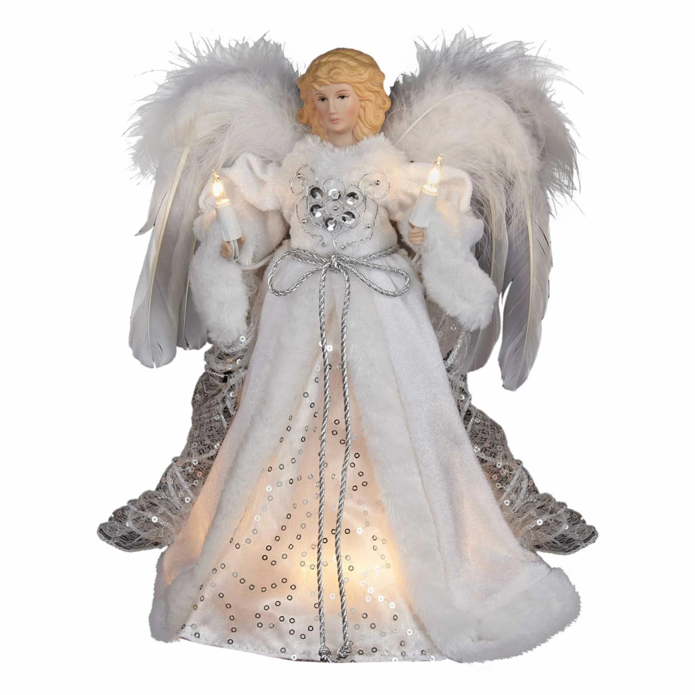 Your tree will look beautiful and elegant with the Kurt Adler 12 in. 10 Light White and Silver Angel Treetop sitting on top. This lovely angel comes with 10 pre-lit lights and wears a white gown with silver accents which perfectly compliment her soft, feathery wings.