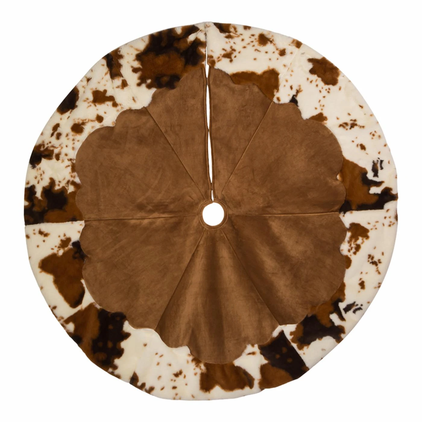 This 48-Inch Corduroy Cow Print Tree Skirt from Kurt Adler is a fun and unique way to add the finishing touch to the dΓ©cor of your Christmas tree. The perfect way to complement a western themed Christmas tree, this brown corduroy tree skirt features a brown and white cow print border.