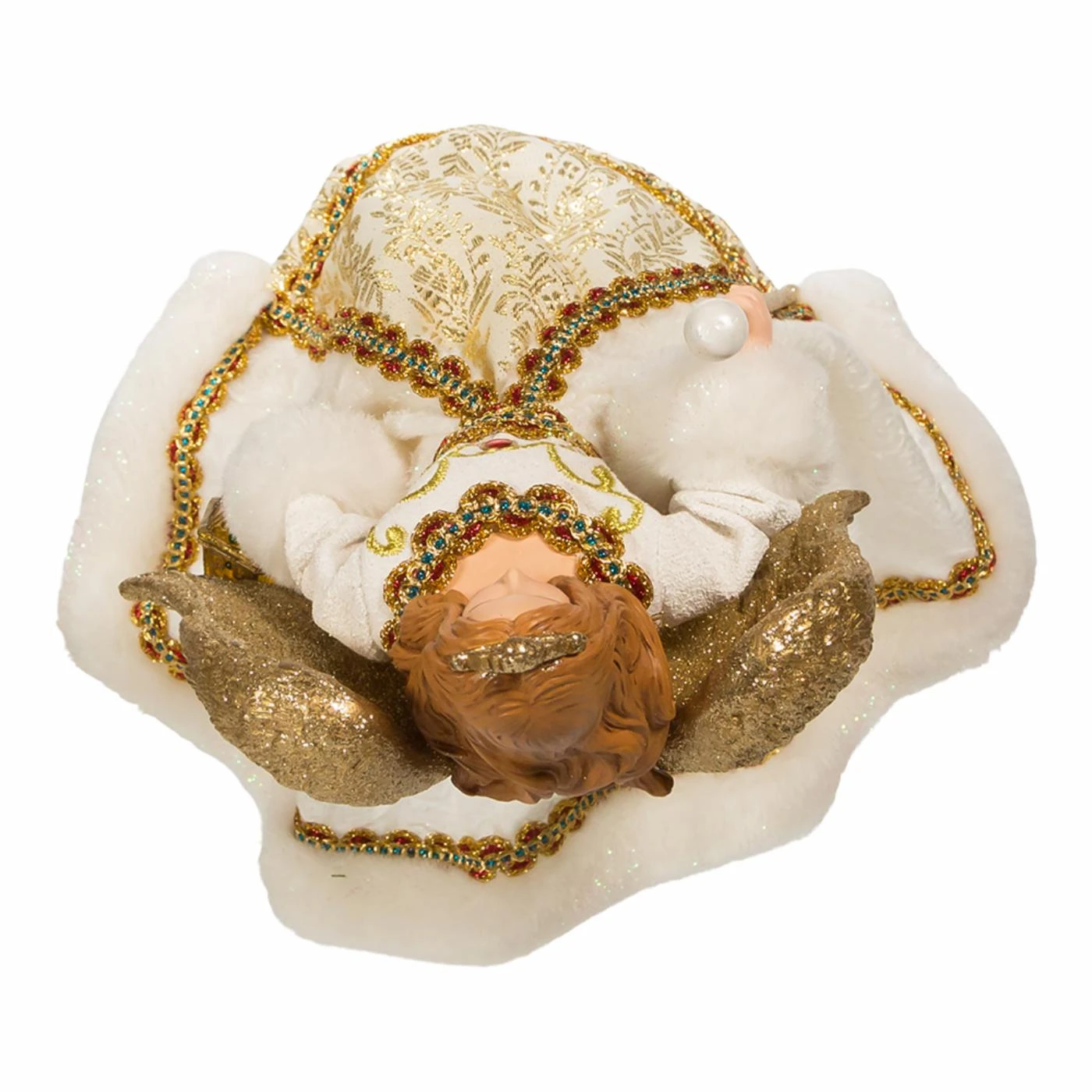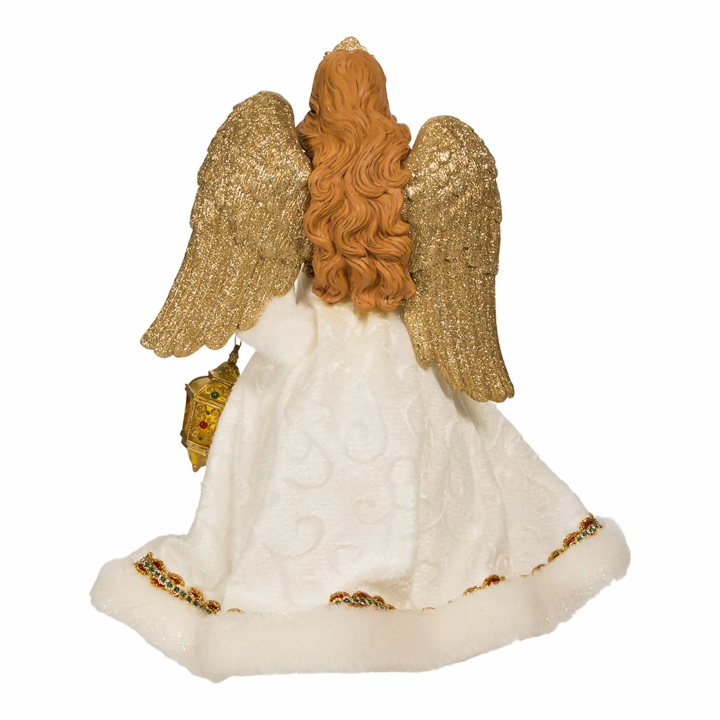 Kurt Adlers jeweled white and gold angel treetop is a beautiful addition to your holiday dรฉcor or Christmas tree. This angel is wearing a beautiful white and gold dress, with a red gemstone accent and he has gold glittered wings. In one hand she is holding a gold glittered lantern with multicolor gemstones and in the other she holds a gold glittered staff.