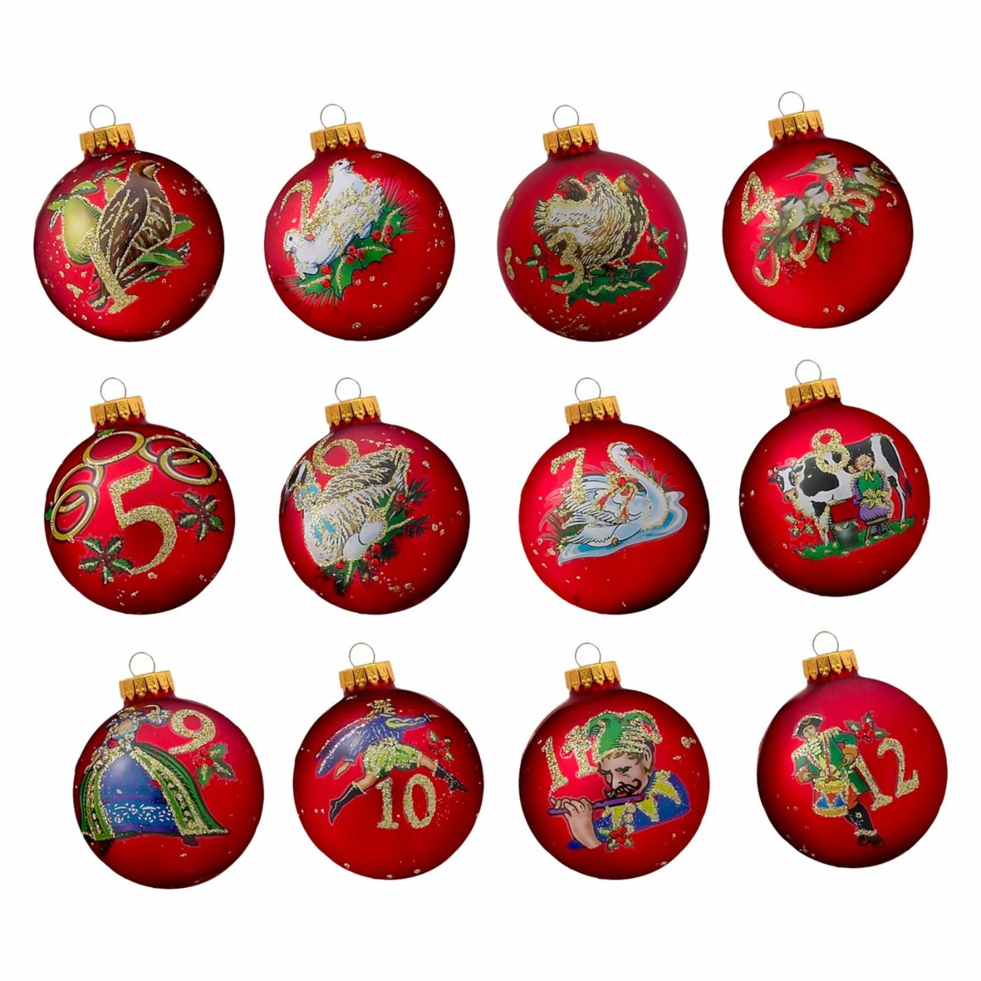 The beautifully painted Kurt Adler 12 Days of Christmas Ball Ornament – Set of 12 represent each of the 12 days of Christmas. These red glass ball ornaments are embellished in gold glitter. The set includes 12 ornaments.