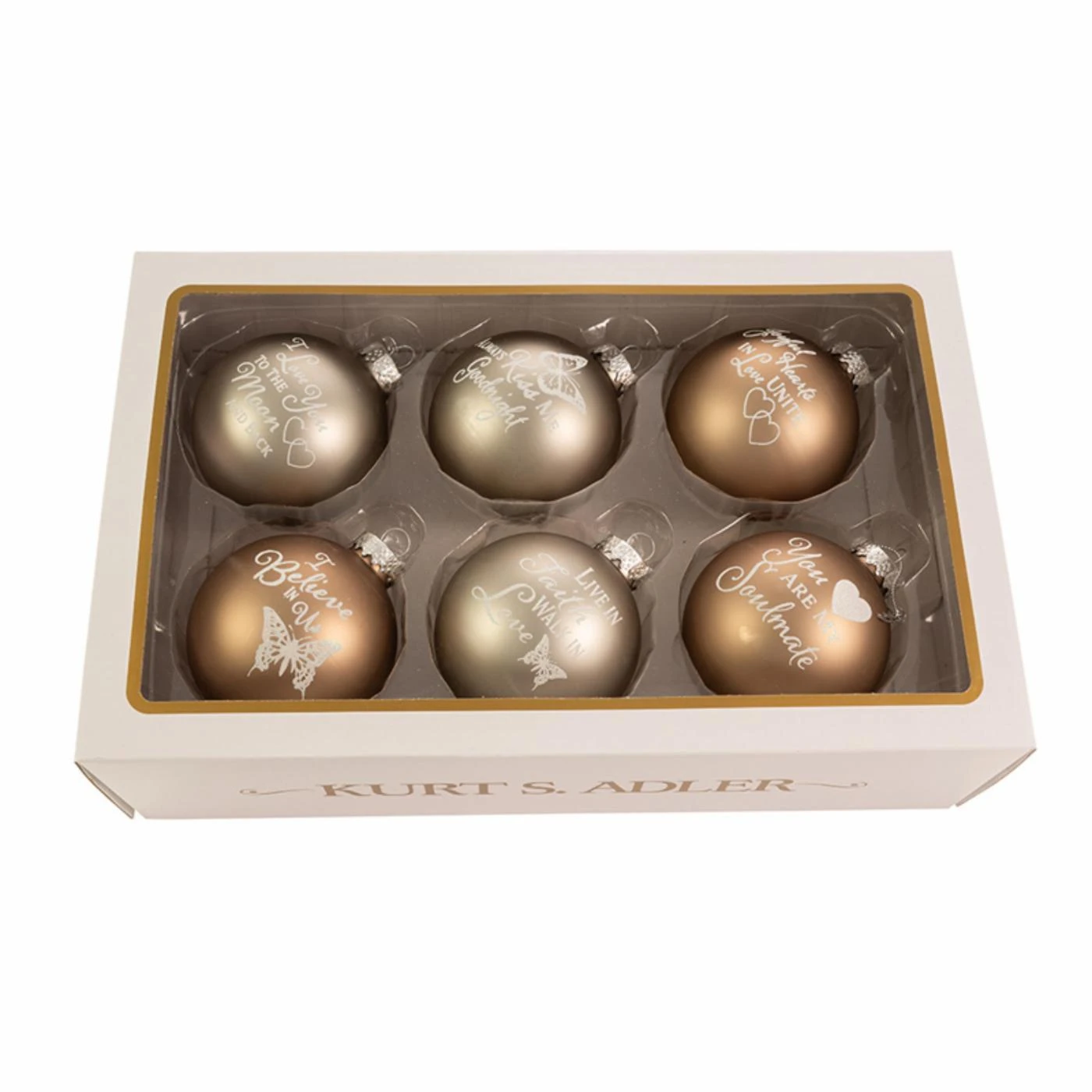 Express your affection every season with the Kurt S. Adler Country Home Sentiment Ball Ornaments – Set of 6, boasting sweet and sentimental loving phrases. Sleek metallic finishes add a glam touch to this sweet set of six ball ornaments.