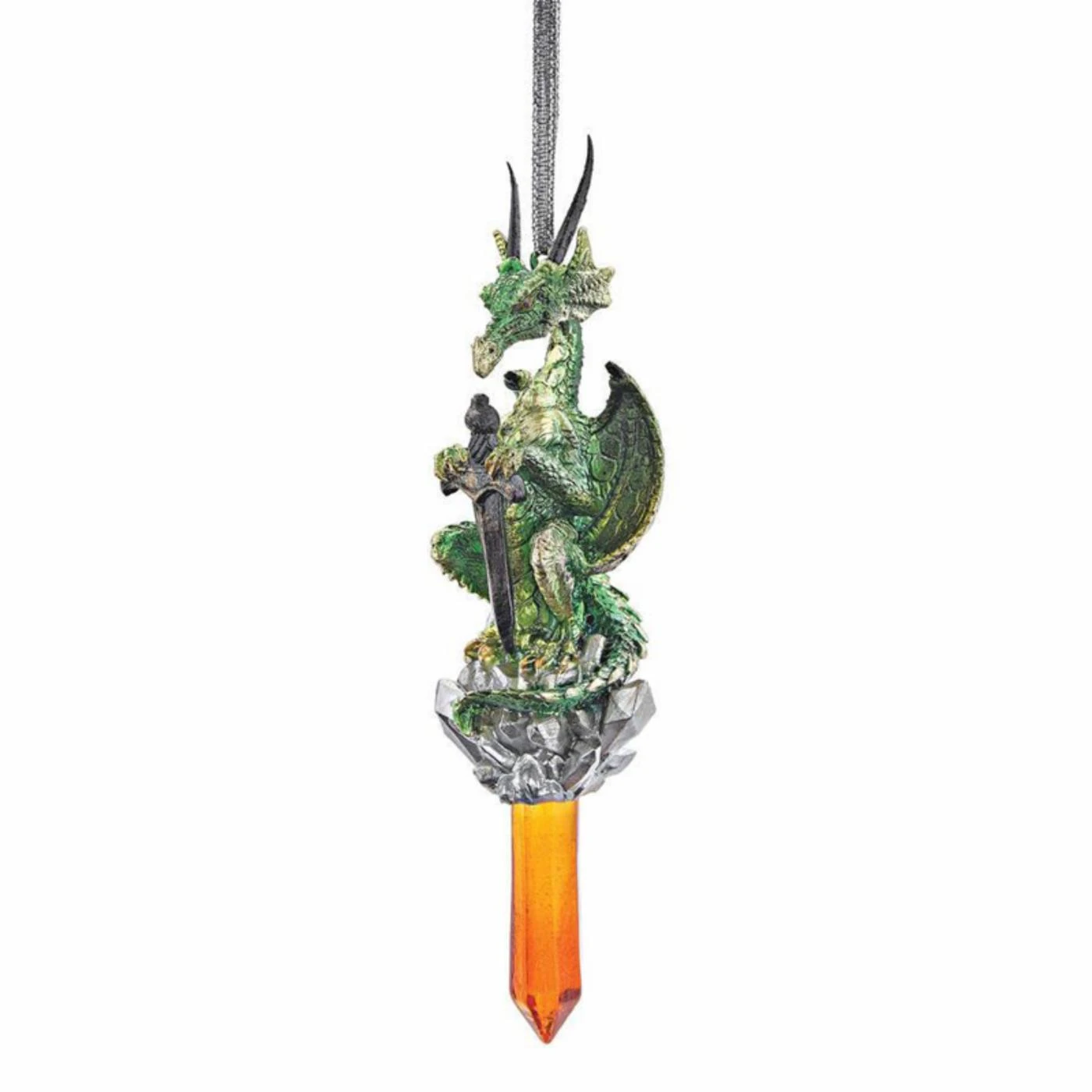 The Design Toscano Cicles the Gothic Dragon Holiday Ornament is a great ornament for the holidays, but there’s no reason that the dragon-themed style needs to stop when the snow melts. This ornate dragon rests on a broadsword as he sits atop a tall, amber-colored crystal. The hand-painted finish adds life to the detailed sculpt that’s cast in a mix of crushed stone and designer-quality resin. A hanging ribbon makes it easy to display. You can choose from a single ornament or a larger set to complement any space.