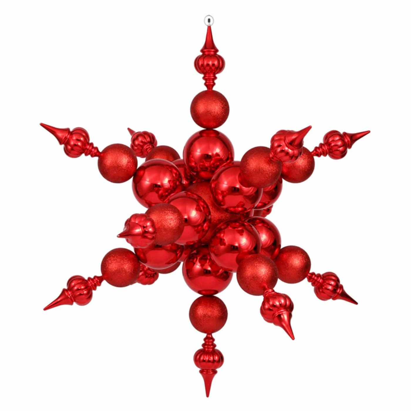 The three-dimensional Vickerman 39 in. Red Radical Snowflake Shiny and Glitter features a collection of shiny red and red glitter ornaments. At 3.25 feet tall, this snowflake ornament is scaled to impress. It’s made of shatterproof plastic and includes a hanging loop for easy display on your large tree or as a ceiling ornament.