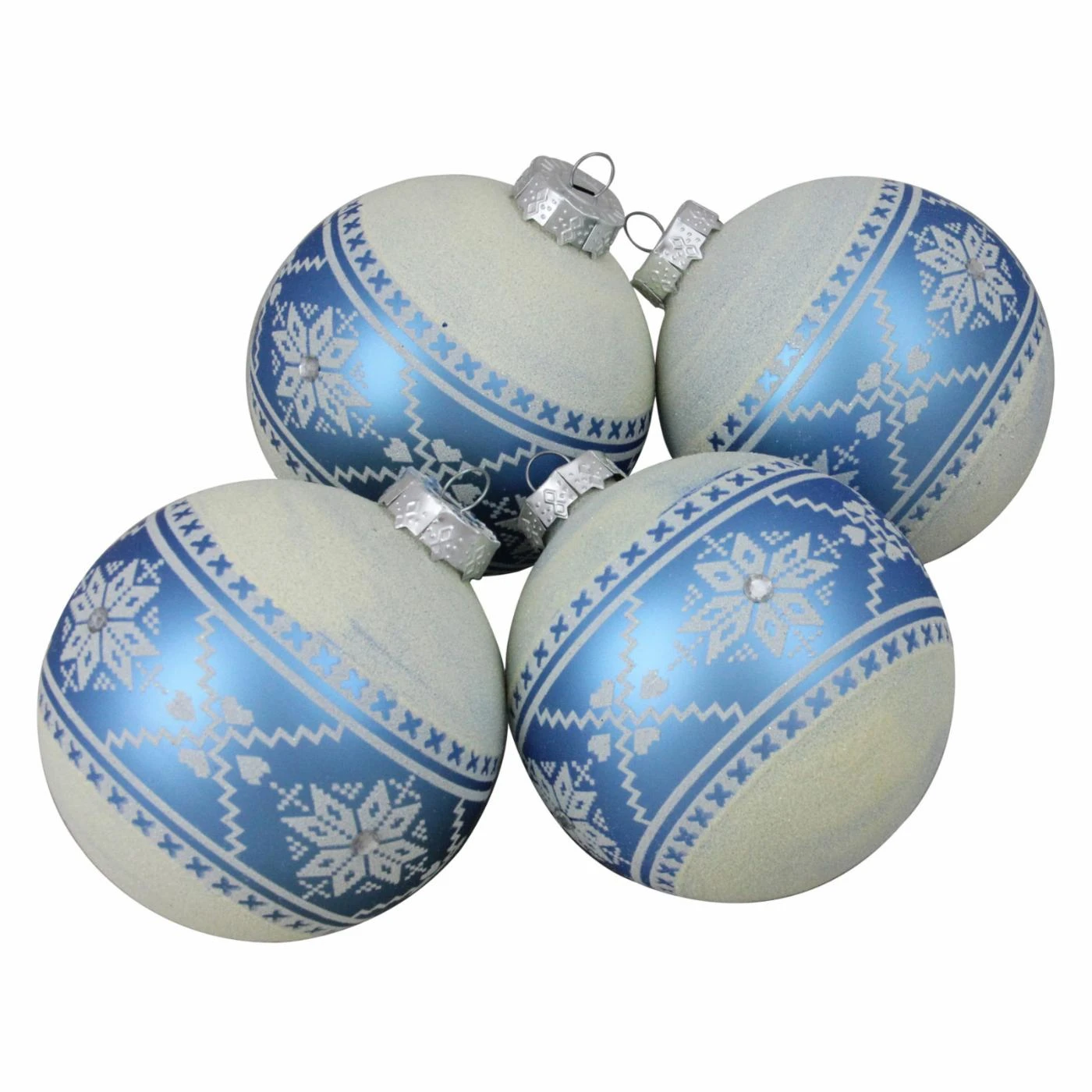 The Northlight 4 in. Glittered and Nordic Patterned Glass Ball Ornament – Set of 4 lends a classic, Nordic look to your dΓ©cor with a snowflake pattern in soft tones of blue and white. This set of four large glass ornaments are accented with silver glitter to bring them a shimmering finishing touch.